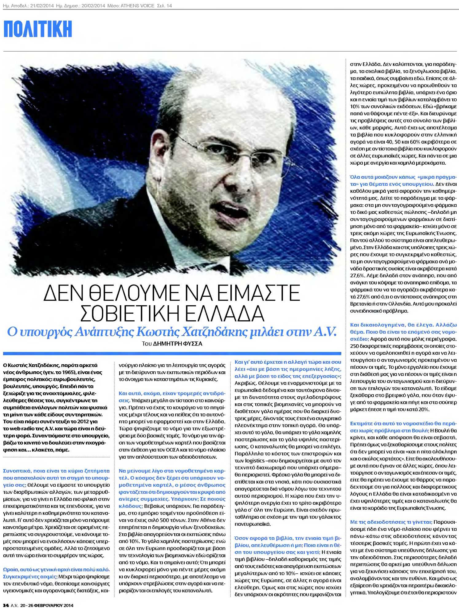Ο υπουργός Aνάπτυξης Κωστής Χατζηδάκης δίνει συνέντευξη στην εφημερίδα Athens Voice