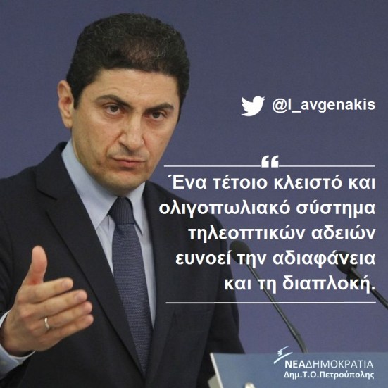 Επίθεση στην κυβέρνηση ότι μετέτρεψε ένα δημόσιο αγαθό που συνδέεται με το δικαίωμα των πολιτών στην πληροφόρηση, στην ψυχαγωγία, «σε αγοραίο προϊόν, το οποίο το κατακτά όποιος δώσει τα περισσότερα, χωρίς κανένα κριτήριο ελέγχου της ποιότητας, χωρίς κανένα κριτήριο προέλευσης χρημάτων» εξαπέλυσε ο γραμματέας της Νέας Δημοκρατίας Λευτέρης Αυγενάκης.